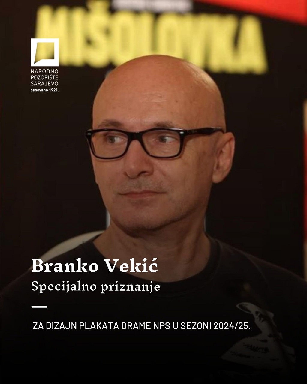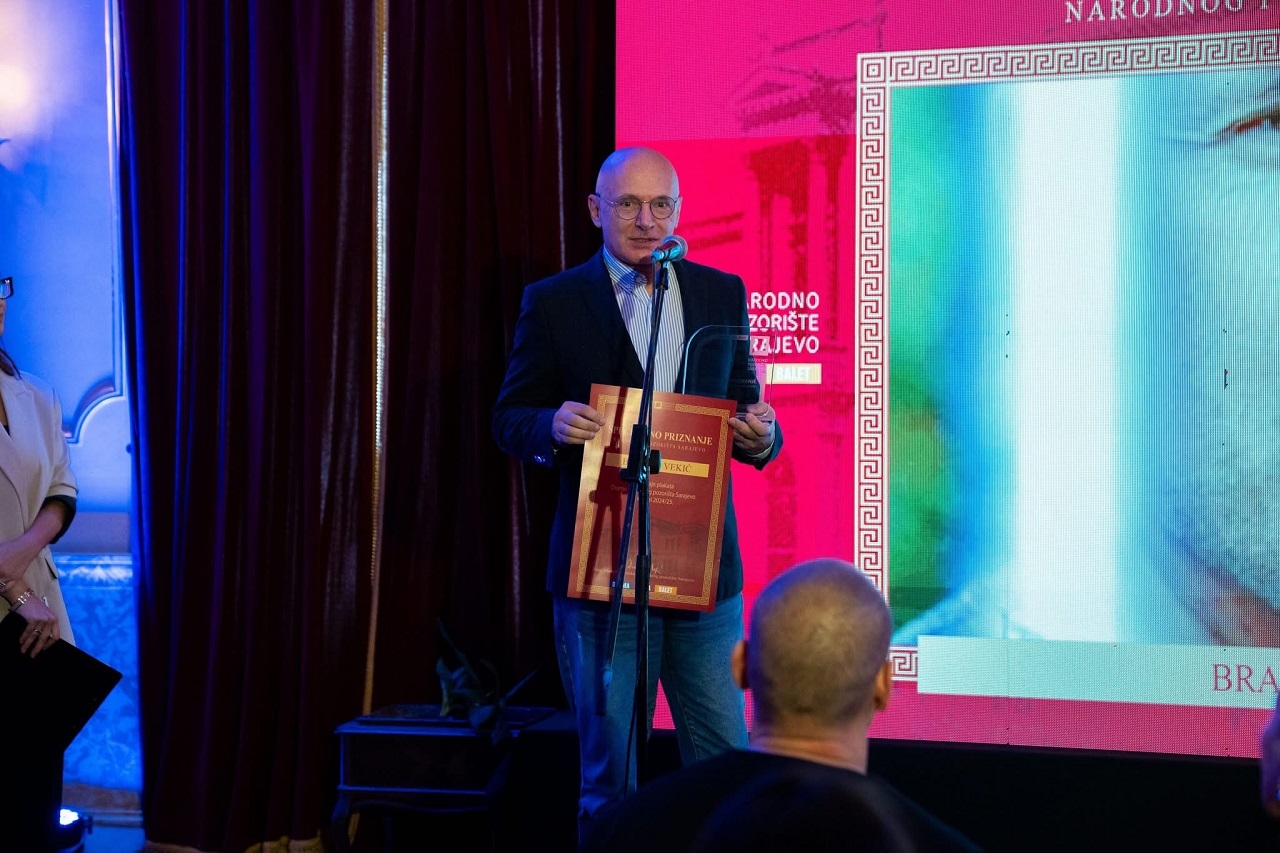 On Wednesday, October 22, 2025, on the occasion of the 104th anniversary of the National Theater in Sarajevo, the Annual Awards Ceremony celebrated outstanding artistic achievements. Among the honorees was Assoc. Prof. Branko Vekić, MFA, from the Visual Arts and Visual Communications Design (VACD) study program at the International University of Sarajevo (IUS), who received the Special Award for Poster Design for the National Theatre Drama plays in the 2024/2025 season.